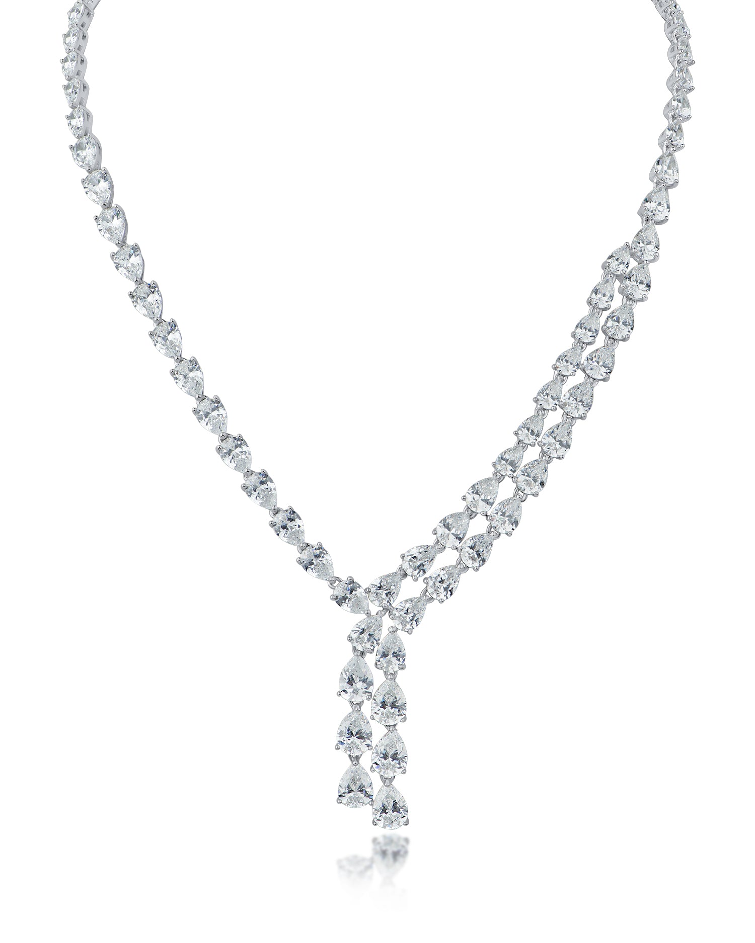 This stunning double-layered Y-necklace features 49 carats total weight of pear-shaped cubic zirconia, creating a dazzling statement piece. Expertly crafted in sterling silver, it adds a touch of elegance and sparkle to any outfit.