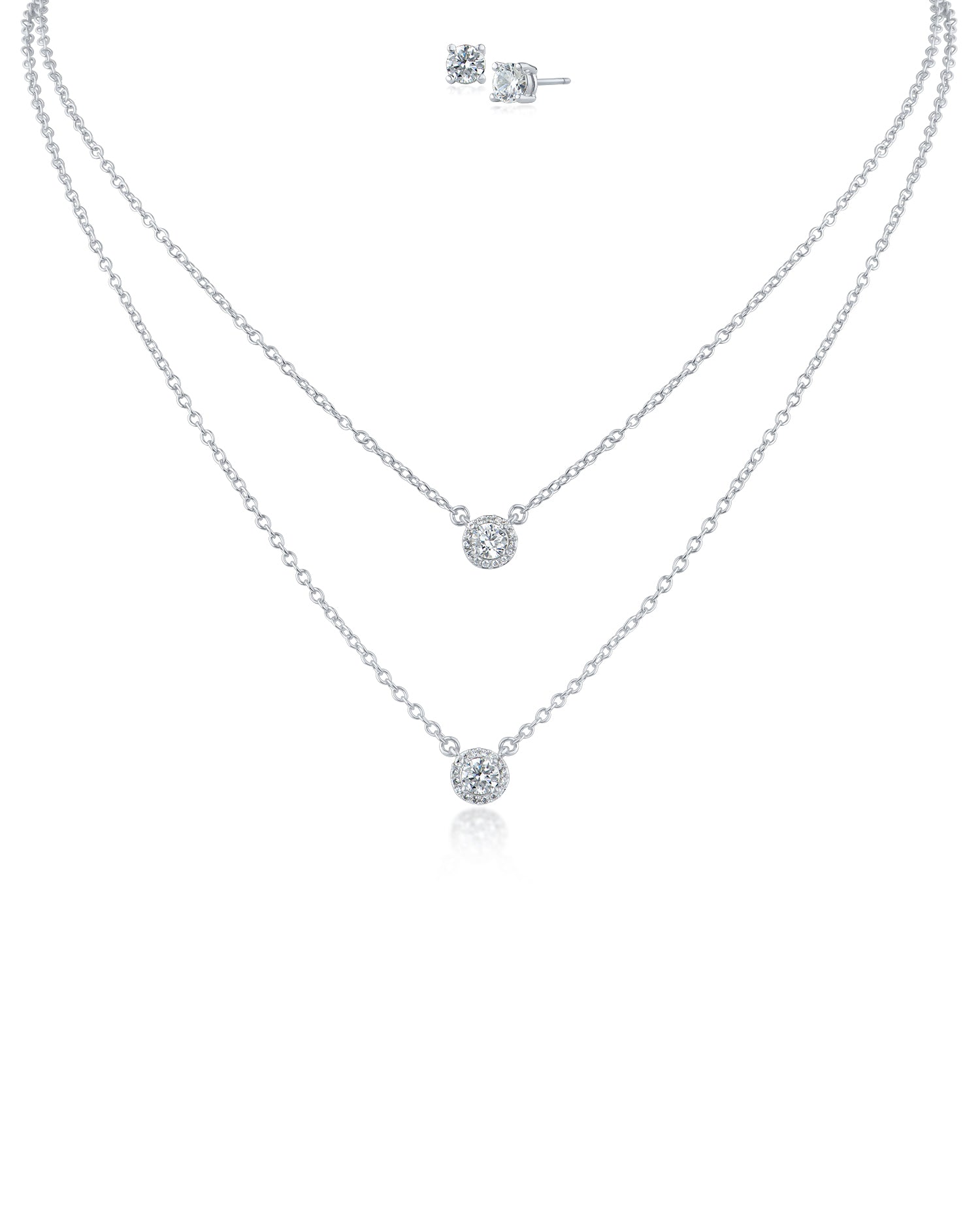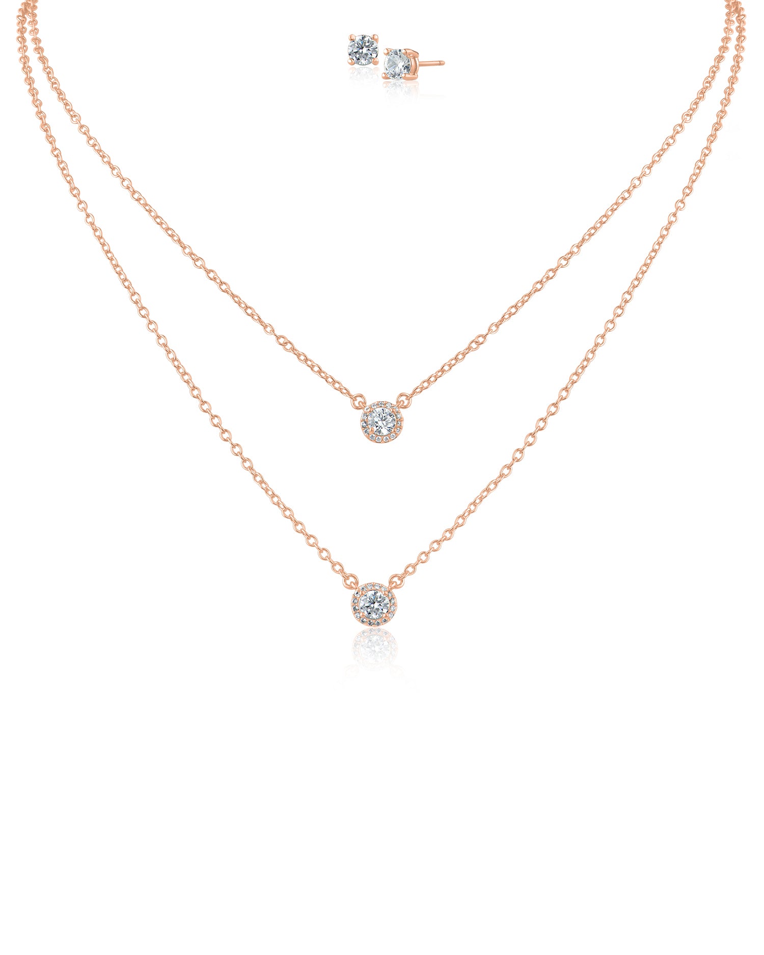 Elevate your jewelry collection with this stunning double-strand necklace featuring a radiant round CZ centerpiece surrounded by a sparkling pavé halo, paired with coordinating stud earrings. Crafted from rhodium or rose gold-plated brass with 3.5 carats of brilliance, this complete set delivers sophisticated style for any occasion. Arrives beautifully presented in our signature gift box—ready to impress.