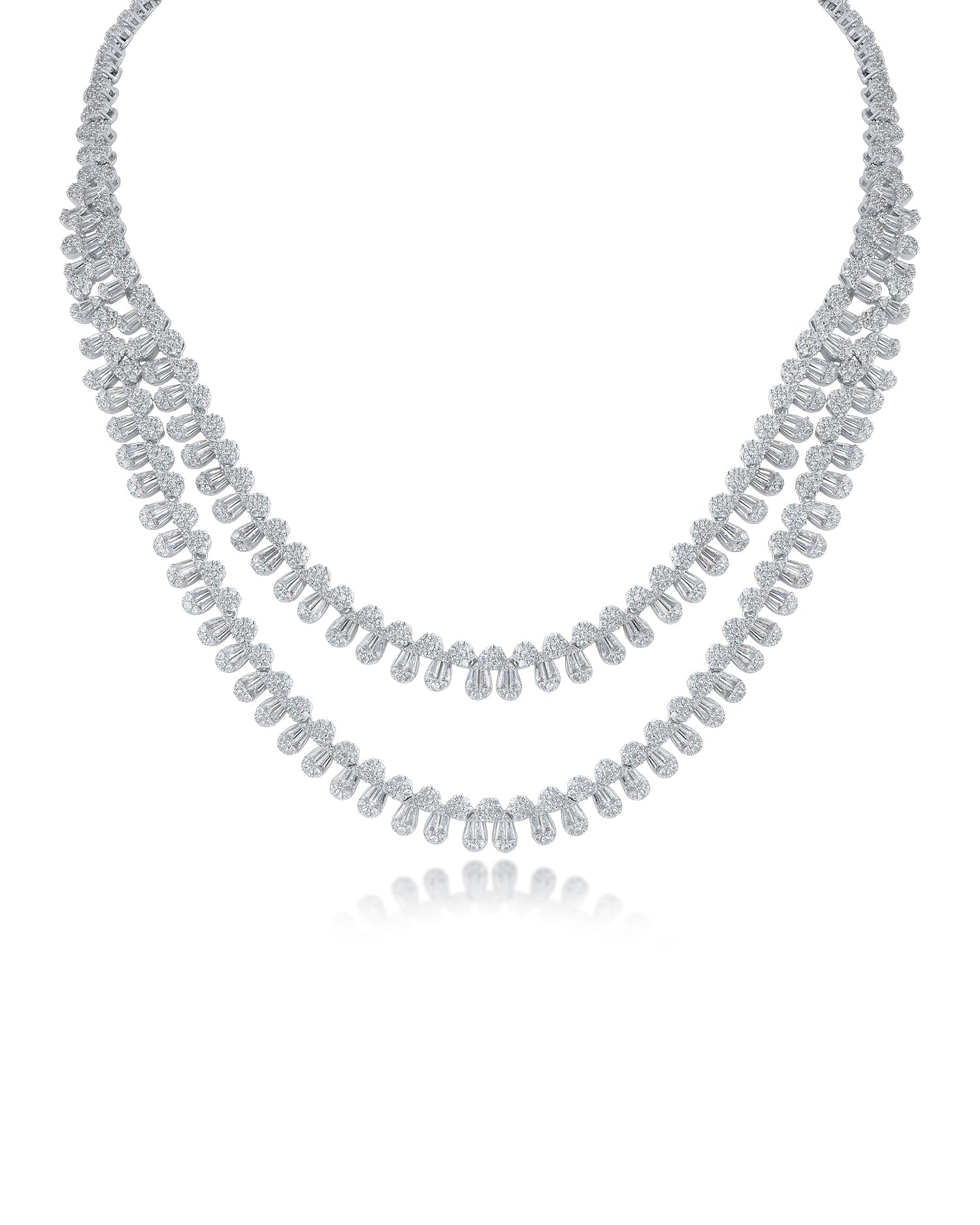 Designed to make an entrance, this double-row necklace features two rows of brilliant round-cut and baguette cubic zirconia, each hand-set to capture maximum sparkle. Crafted in rhodium-plated brass for a lasting, high-shine finish, it’s a showstopping piece that adds instant glamour to any look — perfect for evenings out or special occasions.