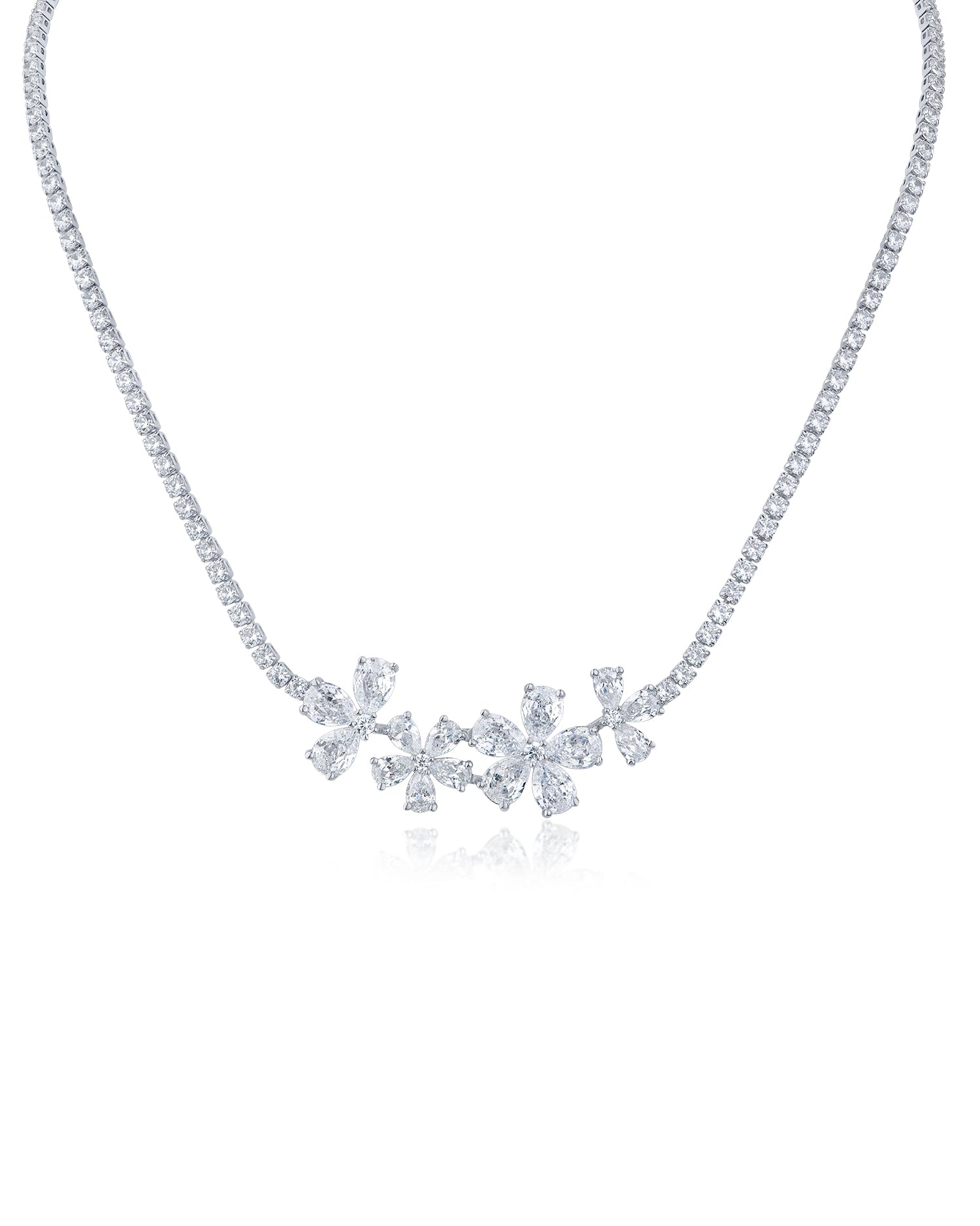 Elegant floral necklace featuring round and marquise cubic zirconia stones set in rhodium-plated brass. A stunning statement piece that brings timeless sophistication to any occasion.