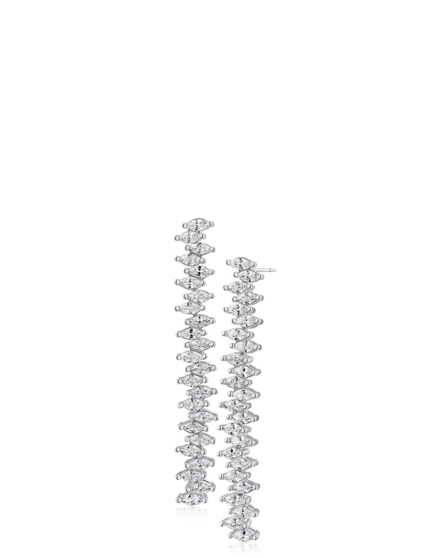 Captivating marquise cubic zirconia earrings featuring a dynamic zigzag silhouette. Rhodium-plated brass setting delivers sophisticated sparkle that catches every light.