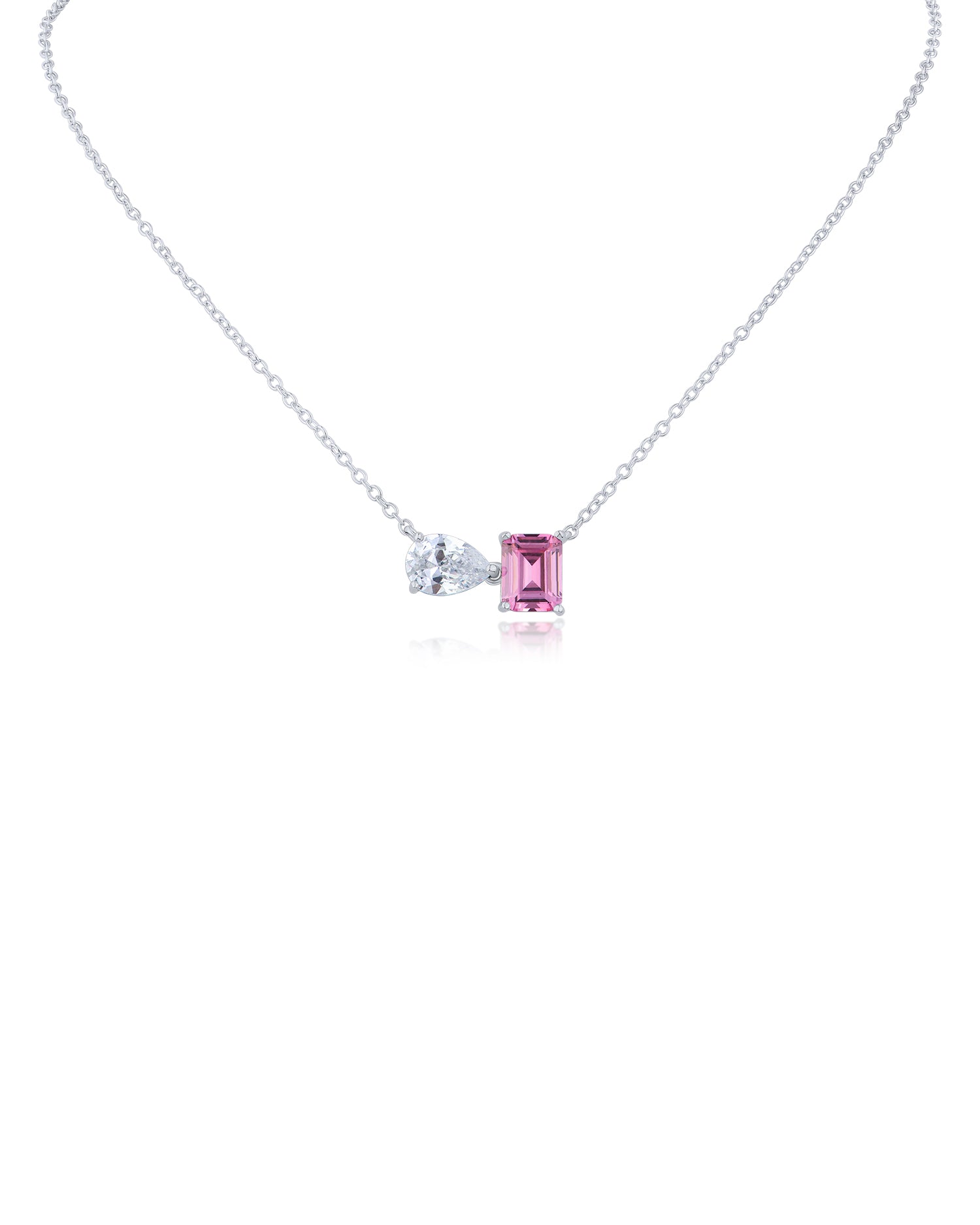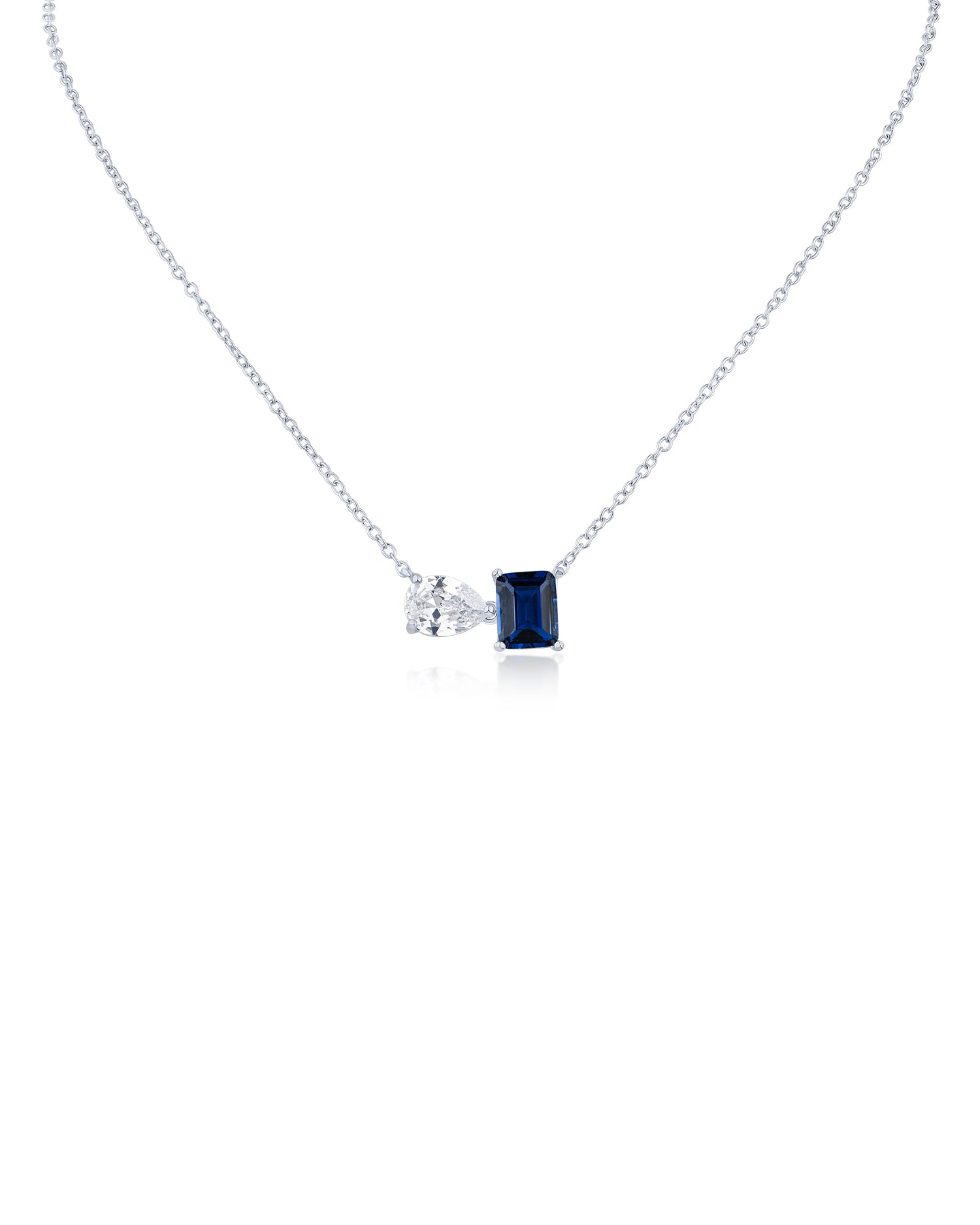A modern take on classic style. Pear and emerald pendant in rhodium-plated brass—bold, elegant, unforgettable.