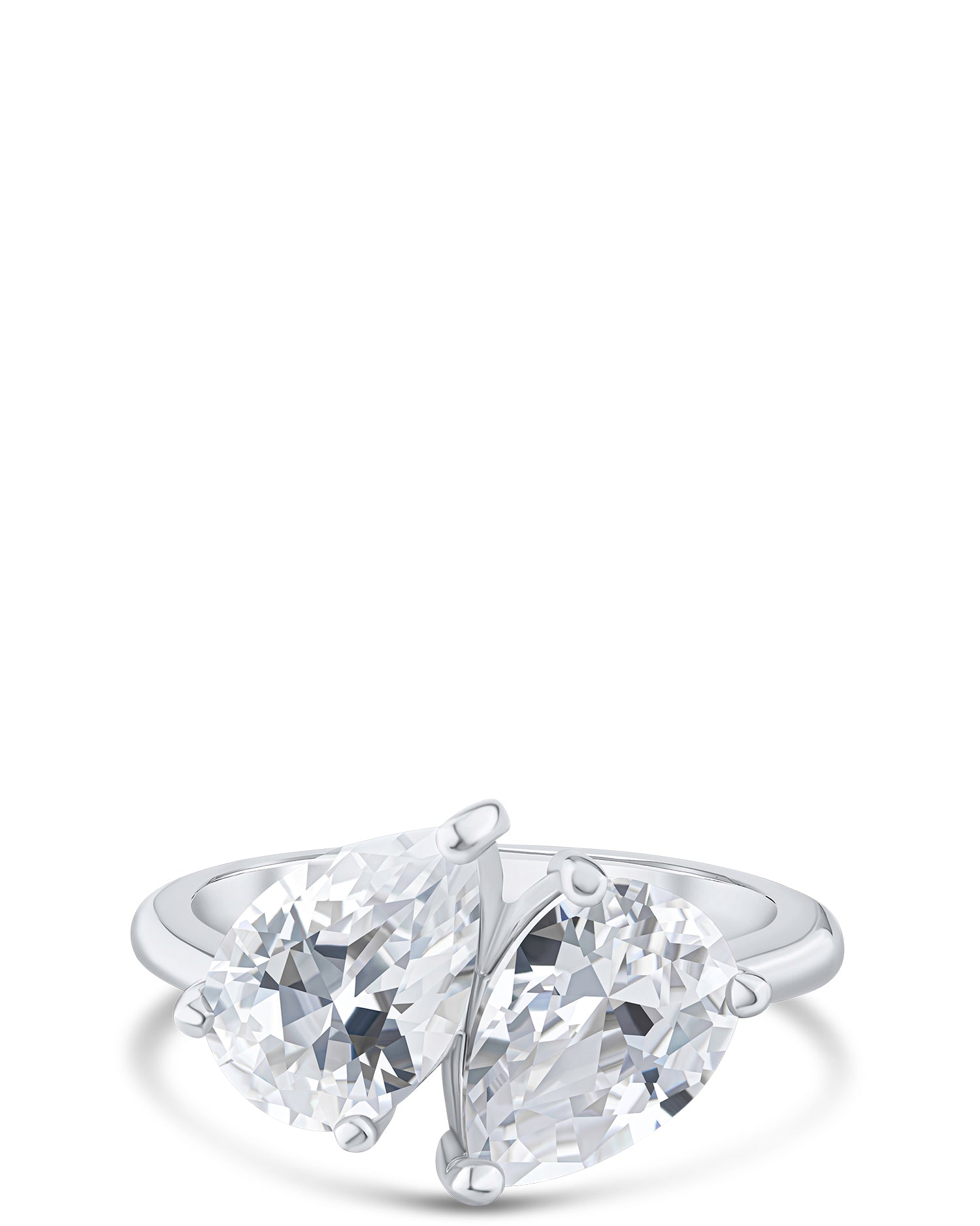 This striking ring features two pear-shaped cubic zirconia stones totaling 4 carats, beautifully set in rhodium-plated brass for lasting shine and elegance.