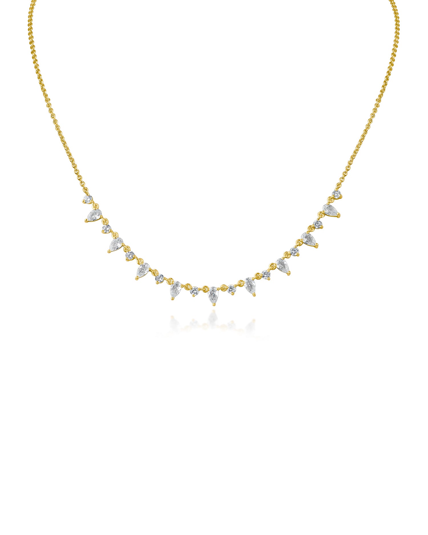 Graceful pear cubic zirconia pendant featuring 3 carat total weight on a delicate chain. Gold-plated brass construction offers versatile sparkle for everyday styling or layering.