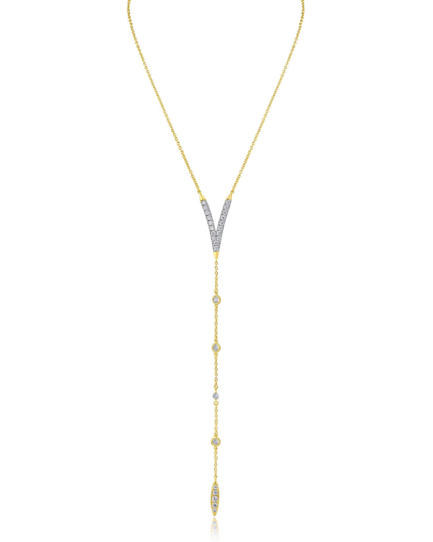 Gold plated Y-necklace featuring a pave V-shaped pendant with bezel set details.