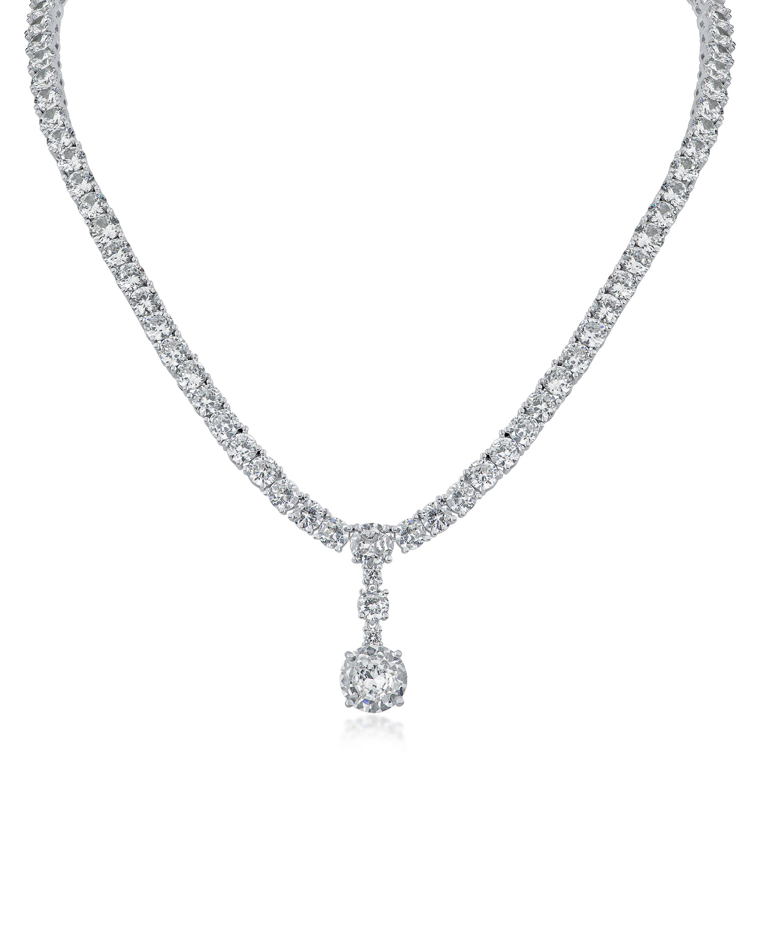 Radiant cubic zirconia drop necklace crafted in rhodium-plated brass. Make an unforgettable impression with this dazzling statement piece that sparkles from every angle.