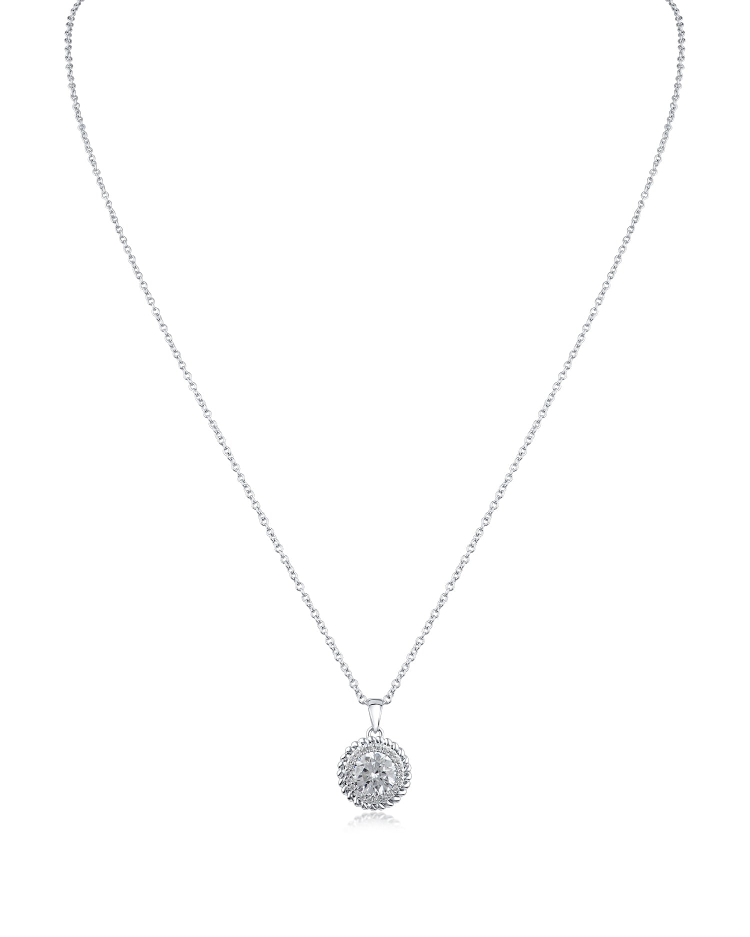A radiant round cubic zirconia pendant with pavé halo in rhodium-plated brass. Timeless elegance for everyday wear.