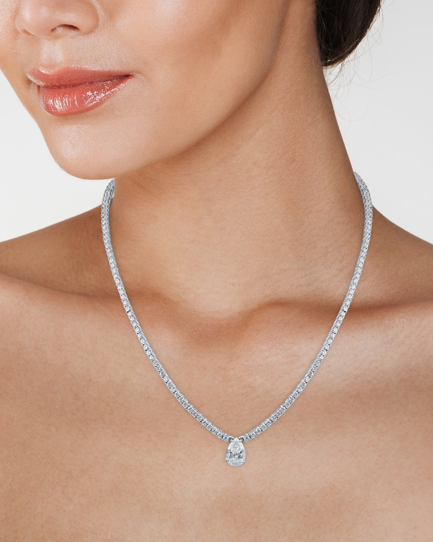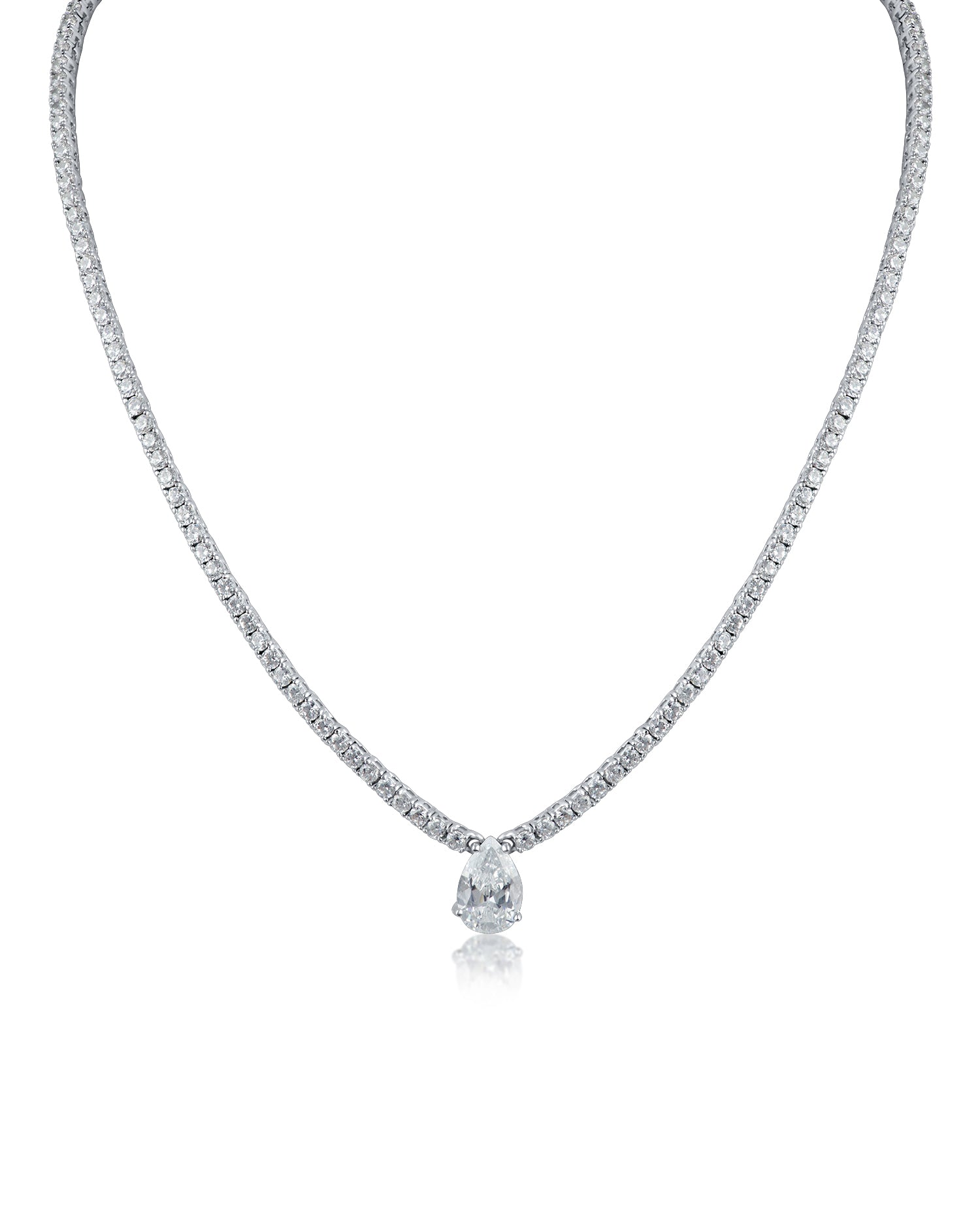 Stunning cubic zirconia tennis necklace featuring a dramatic pear drop. This rhodium-plated brass piece delivers classic elegance with modern impact—the perfect statement accessory for any occasion.