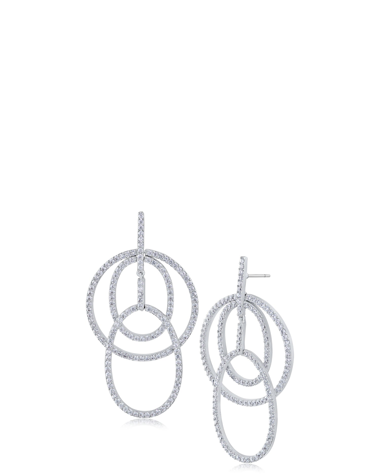 Stunning pave cubic zirconia drop earrings featuring overlapping open circles in rhodium-plated brass. A bold, eye-catching design that elevates any look.